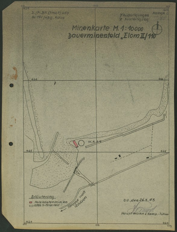 Dossier allemand de minage, commune de Tréflez, champ de mines permanent Elorn II/110 : plan de situation, 26 mars 1943Immatriculation