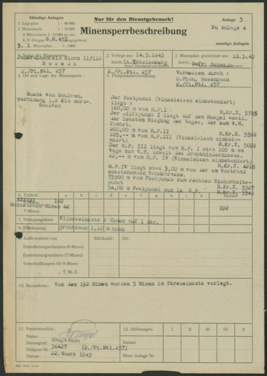 Dossier allemand de minage, commune de Tréflez, champ de mines permanent Elorn II/110 : description du champ de mines nommé Reseda, réséda, 27 mars 1943 [192 engins de type Holzkasten-Minen]Immatriculation