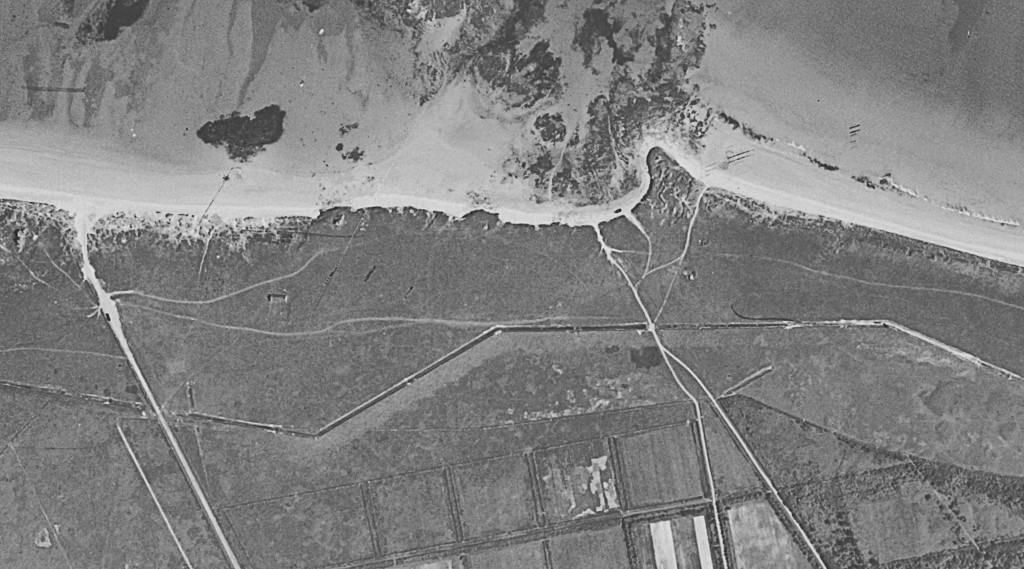 Vue aérienne verticale : pointe dEnez-Vihan et environ (1950-1965). Le fossé antichar est bien visibleImmatriculation