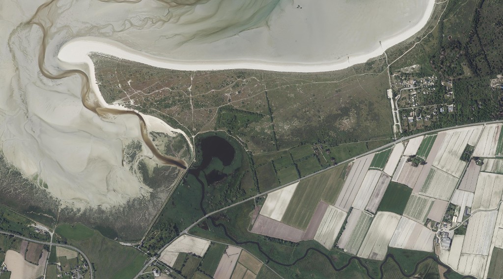 Vue aérienne verticale : partie ouest (2024). Le fossé antichar est partiellement remblayé et végétalisé. La flèche sableuse de Penn ar C'hleuz a énormément évolué depuis 1950Immatriculation