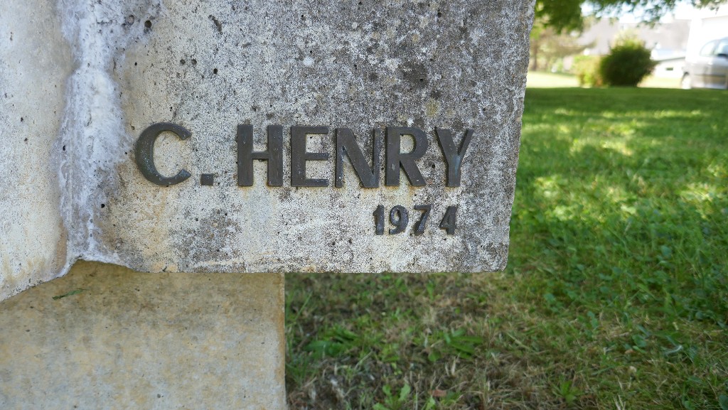Sculpture de Claudine Henry, réalisée en ciment blanc, en 1974. Détail sur la signature.Immatriculation