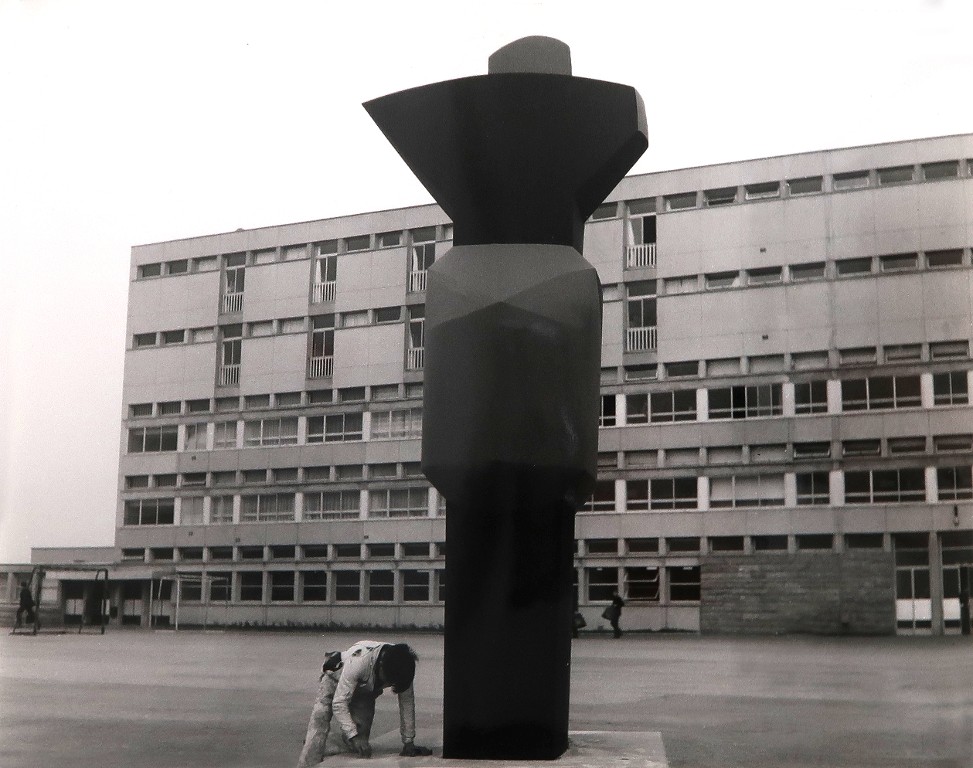 Emile Gilioli, sculpture en tôle (disparue). Cliché pris lors de sa mise en place (1968).Immatriculation