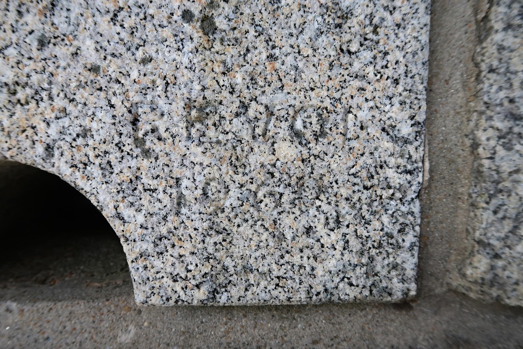 Guy-Charles Revol, sculpture en granite bleu, 1967 : détail sur la signature et la date.Immatriculation