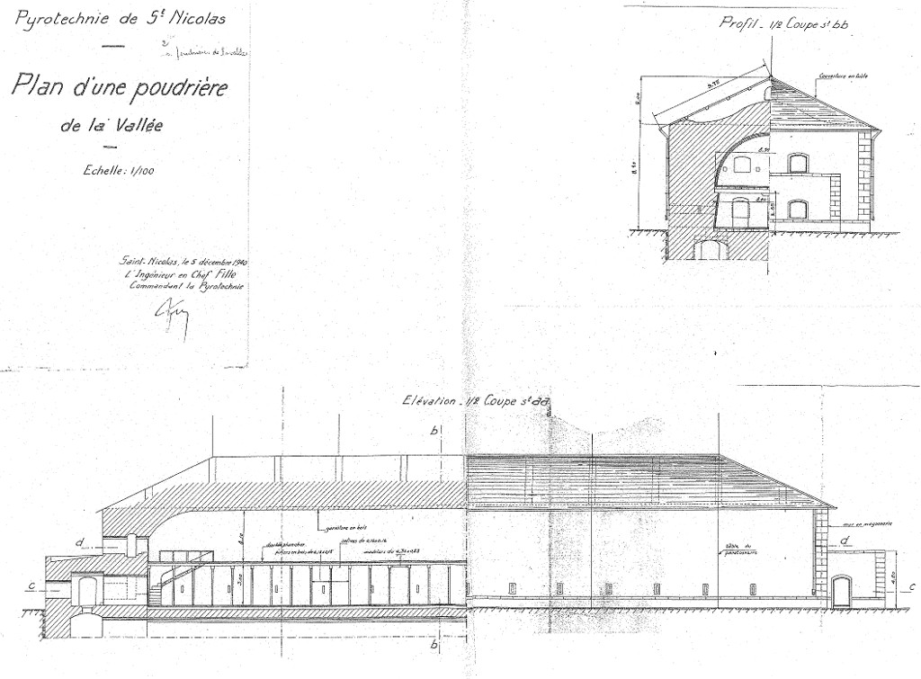 Plan d'une poudrière de la vallée de Kerhuon, signé de l'ingénieur en chef Fille, commandant de la Pyrotechnie, 5 décembre 1940 : coupes et élévations longitudinales et transversalesImmatriculation