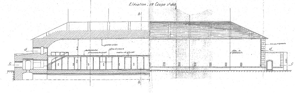 Plan d'une poudrière de la vallée de Kerhuon, signé de l'ingénieur en chef Fille, commandant de la Pyrotechnie, 5 décembre 1940 : coupe et élévation longitudinalesImmatriculation