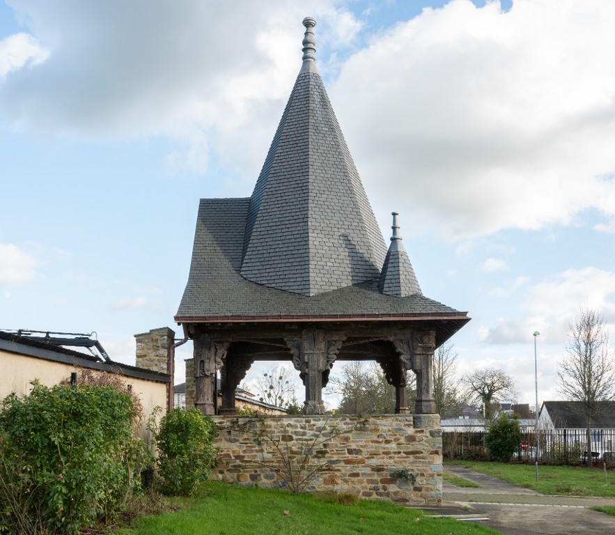 Côté du porche, surmonté d'une couverture tronconique et de deux clochetons.Immatriculation