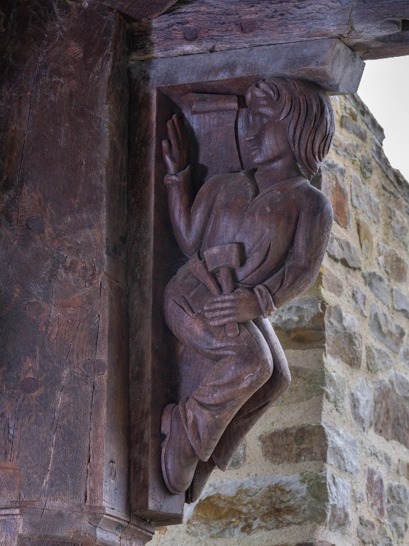 Personnification d'un ouvrier du patrimoine bâti, sculpté par Pascal Poirier et mis en place en 2020 (atelier à Feins, 35).Immatriculation