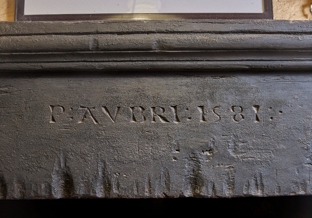 Logis principal. Salle. Cheminée sur le pignon est. Détail de l'inscription sur le linteau : P : AUBRI : 1581 :.Immatriculation