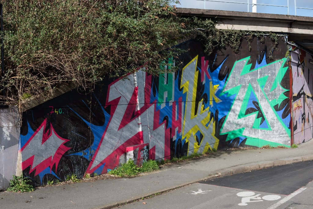 Vue de détail des peintures murales de la culée ouest.Immatriculation