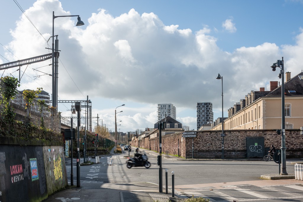 Vue en direction de l'ouest du carrefour routier formé par le croisement du boulevard du Colombier, du boulevard de la Tour d'Auvergne et du boulevard de Guînes, à la hauteur du pont de Nantes.Immatriculation