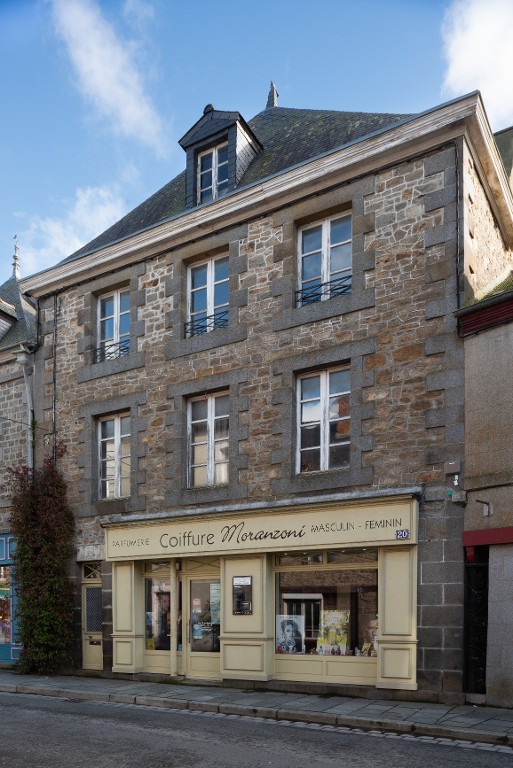 Maison à deux étages et boutique dont la façade sur rue est reprise en maçonnerie à la fin du 19e (état en 2025).Immatriculation