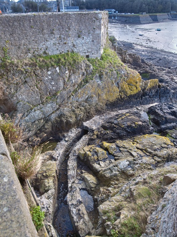 Vue du fossé situé entre la basse-cour et la tour Solidor (sous le pont). On peut observer un canal maçonné aménagé par déroctage du rocher-mère filant vers la grève. En arrière-plan, la basse-courImmatriculation