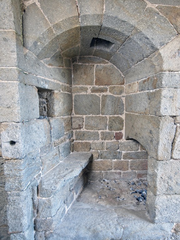 Vue intérieure de la tour Solidor : rez-de-chaussée, poste de garde implanté dans le passage d'entrée au nord. Il comprend un banc en pierre, une cheminée et une niche mural. Dans la voûte se trouve un assommoir accessible depuis le premier étageImmatriculation