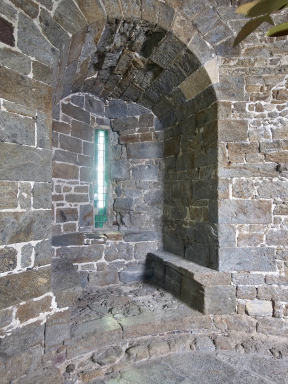 Vue intérieure de la tour Solidor : rez-de-chaussée, tour ouest, arbalétrière-canonnière à double coussiège orientée vers l'ouest. Au niveau du sol se voit l'arase de la fondation (correspondant à la tour primitive)Immatriculation