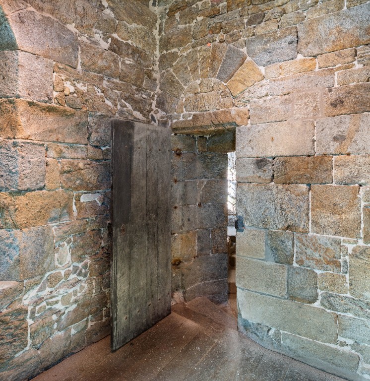 Vue intérieure de la tour Solidor : premier étage, tour est, porte à linteau droit du côté de l'intérieur (surmontée d'un arc de décharge)Immatriculation
