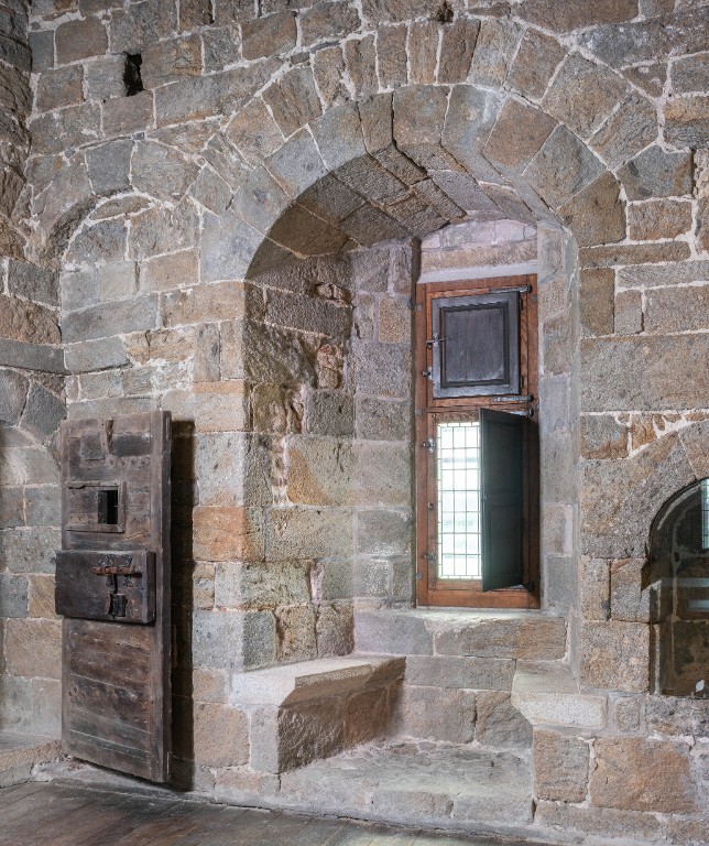 Vue intérieure de la tour Solidor : premier étage, pièce intermédiaire, arbalétrière-canonnière avec double coussiège orientée vers le sudImmatriculation