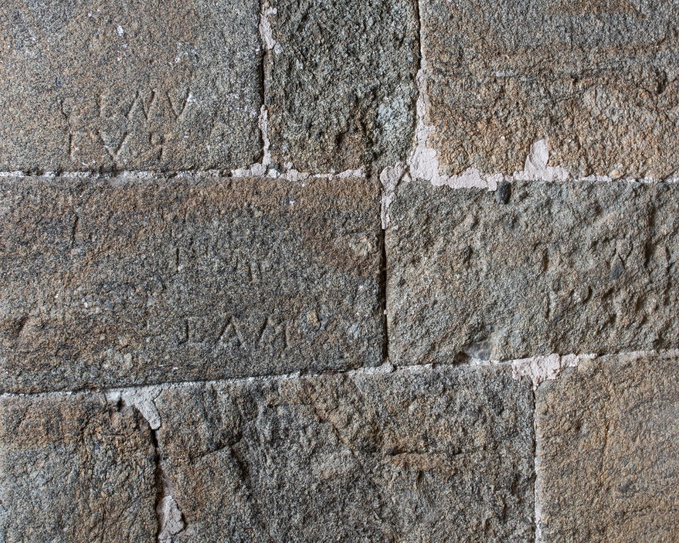 Vue intérieure de la tour Solidor : premier étage, pièce intermédiaire, détail des graffitis situés dans l'ébrasement de l'arbalétrière-canonnière orientée vers le nordImmatriculation
