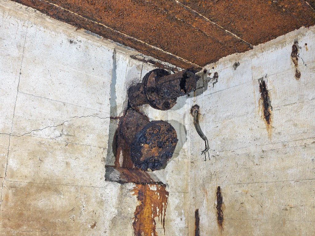 Vue de détail de l'extrémité ouest de la salle de garde : conduit de cheminée (en haut) et conduit de ramonage (en bas) du poêle. Dans le mur, passage de câble électrique du magasin à munitionsImmatriculation