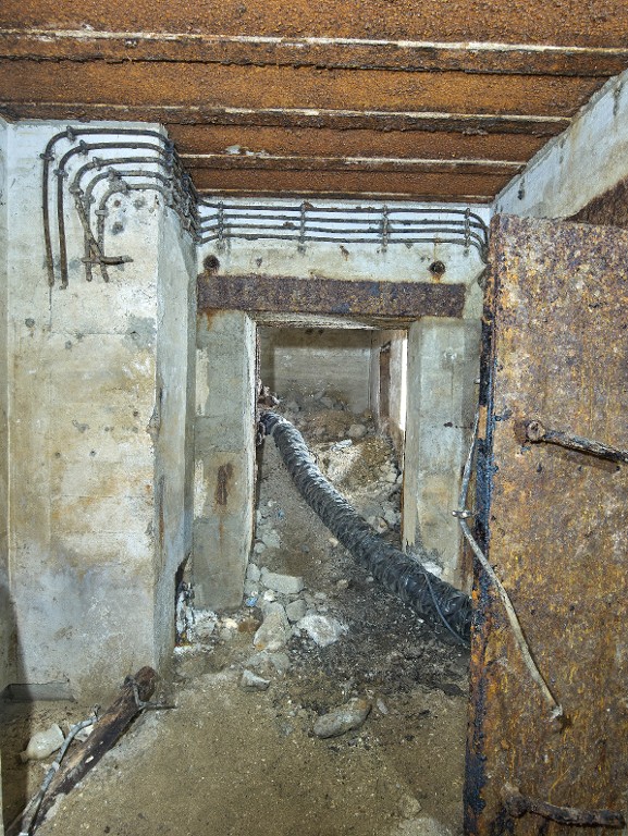 Vue du sas d'entrée vers l'ouest : il est partiellement remblayé (la porte blindée à deux vantaux est masquée). Au fond, l'entrée ouest du bunker. A gauche, le chemin de câble électrique. A droite, l'une des deux portes étanchesImmatriculation