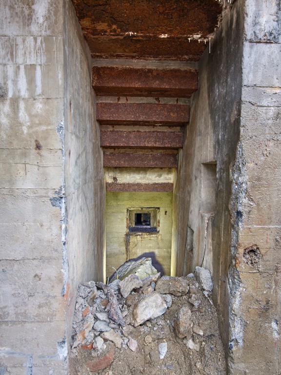 Vue de l'entrée sud : l'escalier d'accès est partiellement remblayé. Au fond, l'ouverture de tir blindée (coffrage en bois est en place)Immatriculation