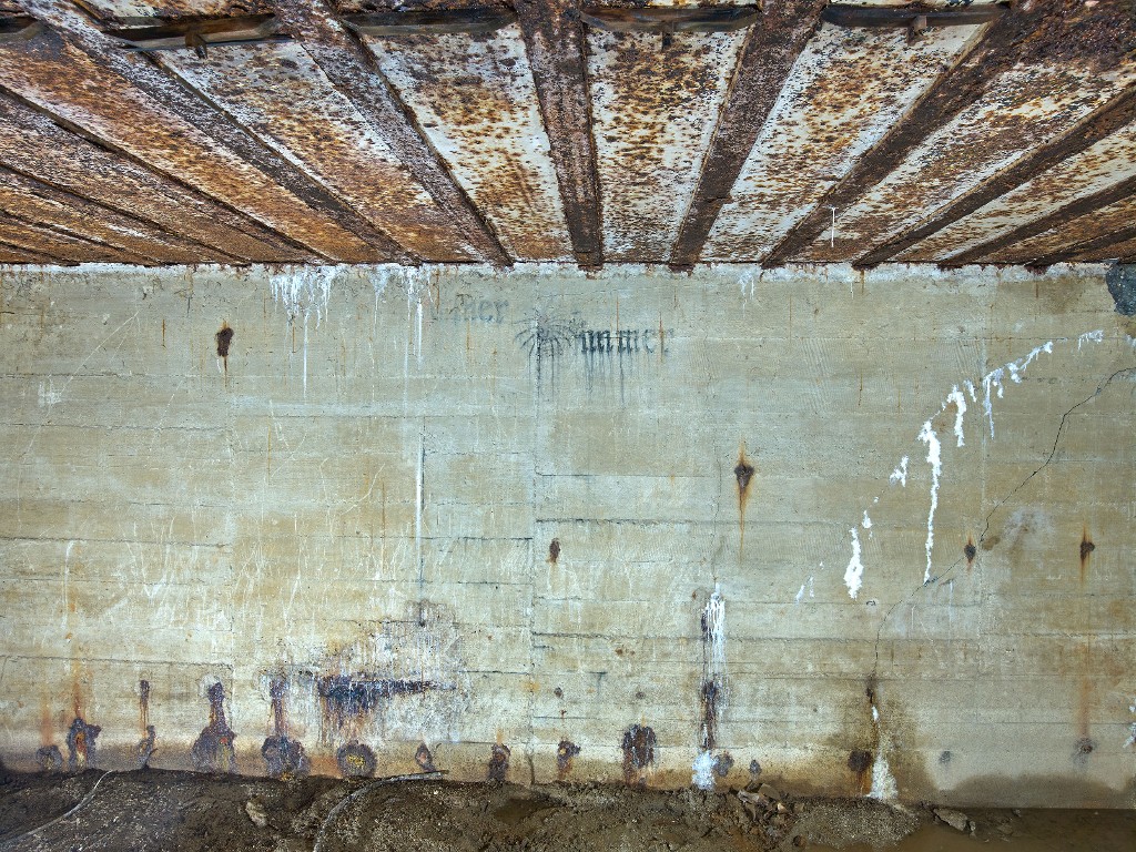 Vue du mur sud du magasin à munitions : peinture murale de couleur noire figurant une araignée sur sa toile entourée d'une inscription en lettre gothique (Eïner / immer)Immatriculation