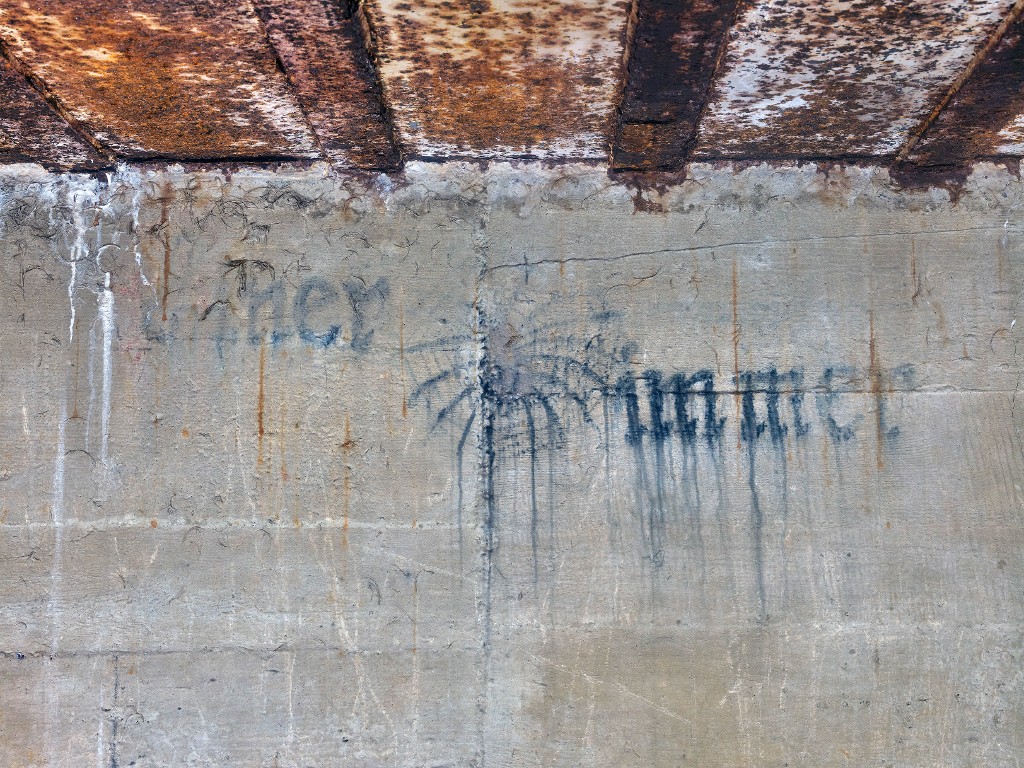 Vue de détail de la peinture murale du magasin à munitions figurant une araignée sur sa toile. Elle est entourée de l'inscription en lettre gothique : Eïner / immerImmatriculation