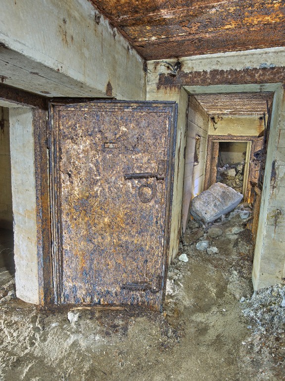Vue du couloir d'entrée depuis le sud. Au premier plan à gauche, la porte étanche du magasin à munitionsImmatriculation