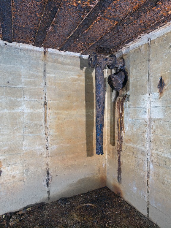 Vue de détail de l'angle nord-ouest de la salle de garde : conduit de cheminée (en haut) et conduit de ramonage (en bas) du poêleImmatriculation