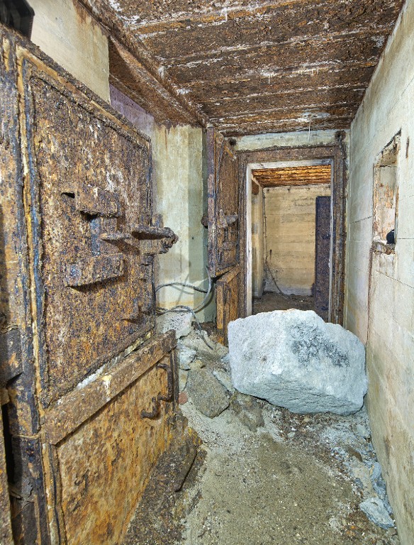 Vue du débouché du couloir de l'entrée sud : il est encombré de gravas. Au premier plan à gauche, porte blindée à deux vantaux du sas de la salle de garde. Au fond, la porte blindée du sas de la caponnière et du magasin à munitionsImmatriculation