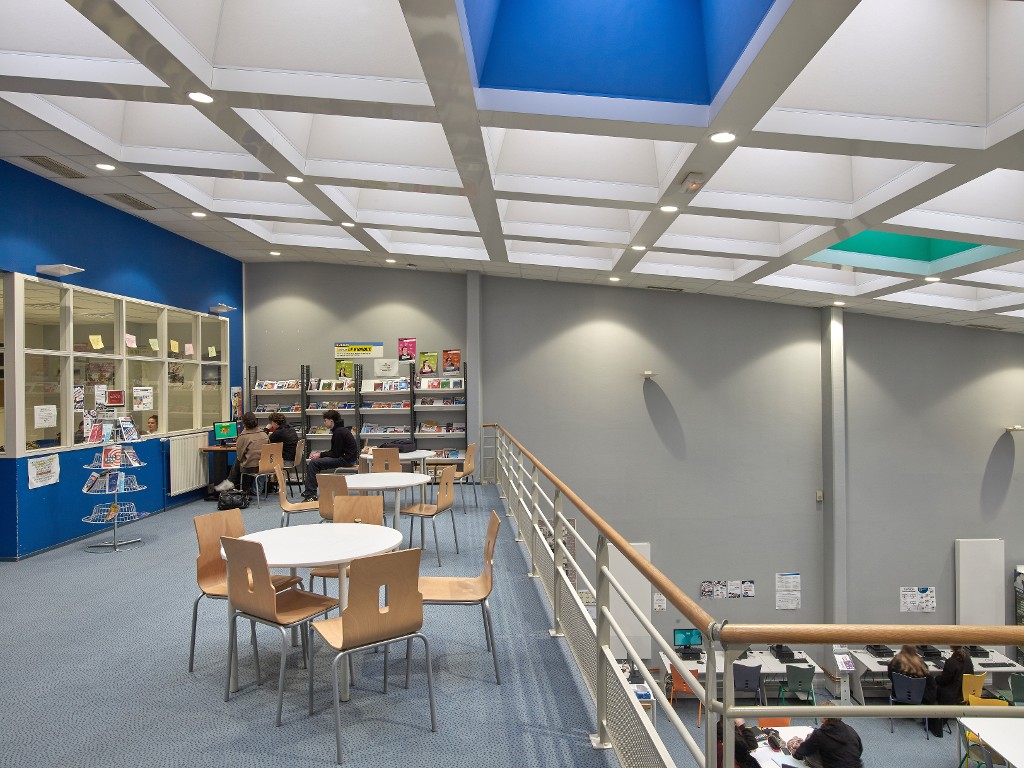Vue d'ensemble de la mezzanine du CDI. Joël Y. Gautier, architecte, 1992.Immatriculation