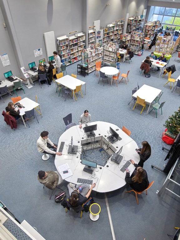Vue partielle du CDI prise depuis la mezzanine. Joël Y. Gautier, architecte, 1992.Immatriculation