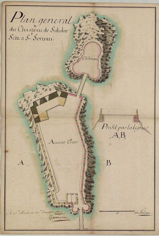 Plan de la Tour Solidor et de son ouvrage avancé par l'ingénieur Garengeau, 27 janvier 1697. Lavé de jaune, le projet avec batterie d'artillerie et corps de gardeImmatriculation