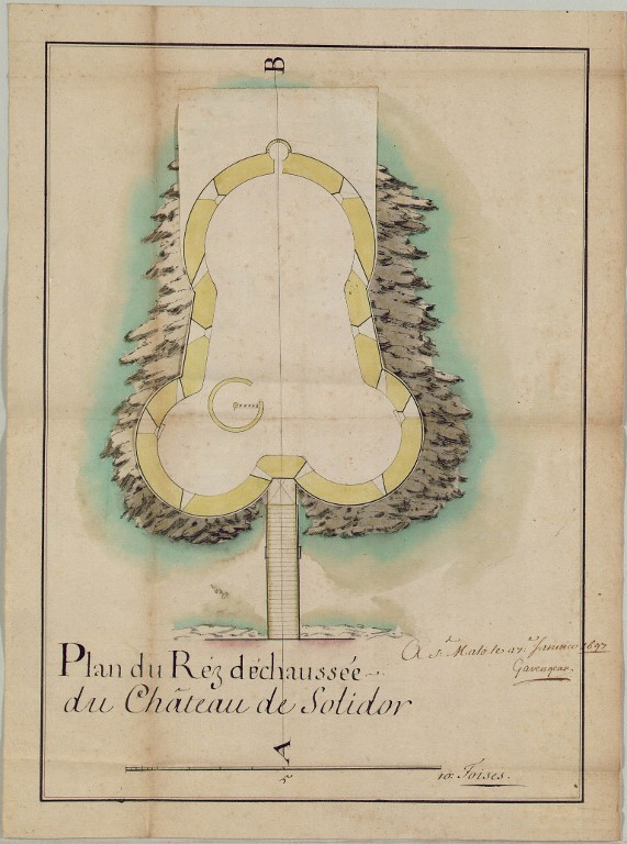 Plan de la plate-forme d'artillerie de la Tour Solidor par l'ingénieur Garengeau, 27 janvier 1697. Lavé de jaune, le projetImmatriculation