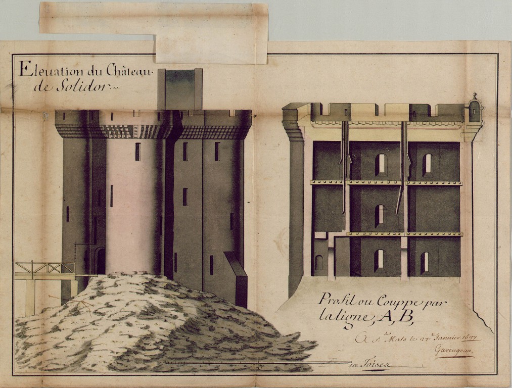 Elévation et coupe de la Tour Solidor par l'ingénieur Garengeau, 27 janvier 1697. Lavé de jaune, le projetImmatriculation