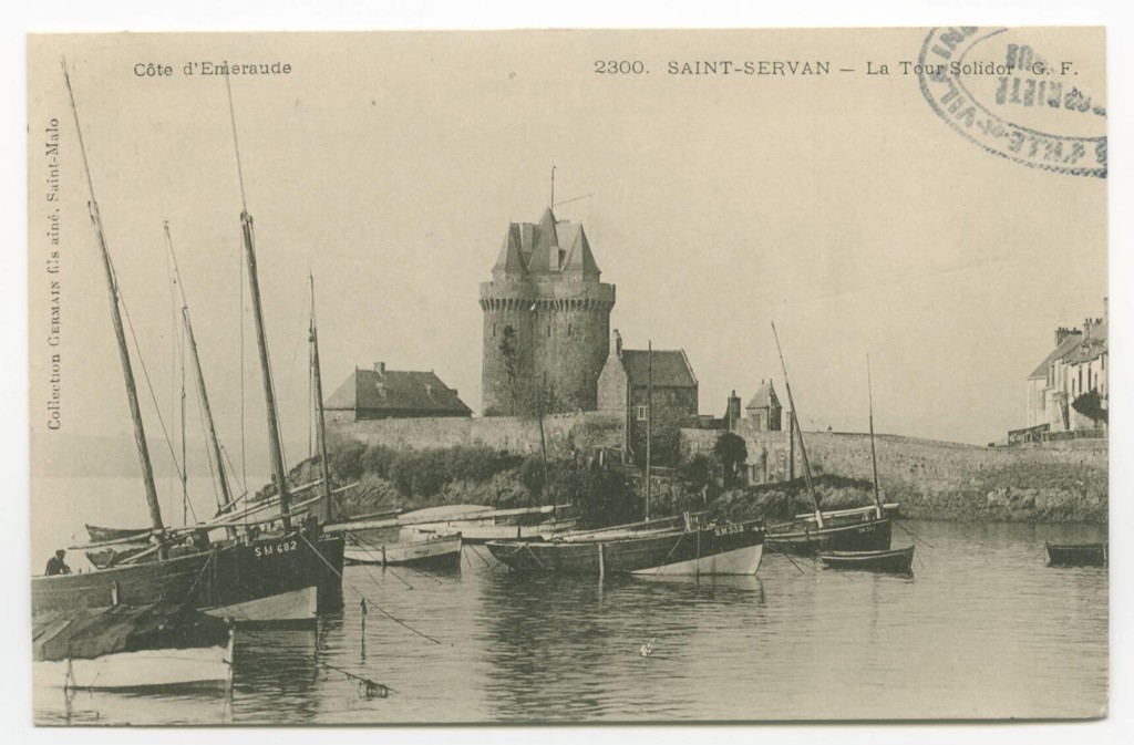 Vue générale de la tour Solidor depuis l'est-nord-est : châtelet d'entrée, corps de garde et caserne sont implantés dans la basse-cour, carte postale (collection Germain, fils aîné, Saint-Malo ; G.F)Immatriculation