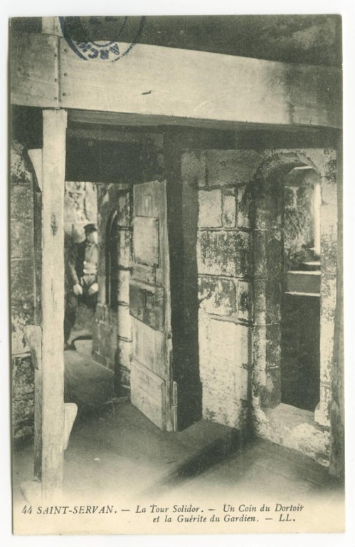 Vue intérieure de la tour Solidor : premier étage, tour nord, niveau intermédiaire à usage de dortoir, carte postale (LL). A gauche, le poteau est muni de plusieurs marchesImmatriculation