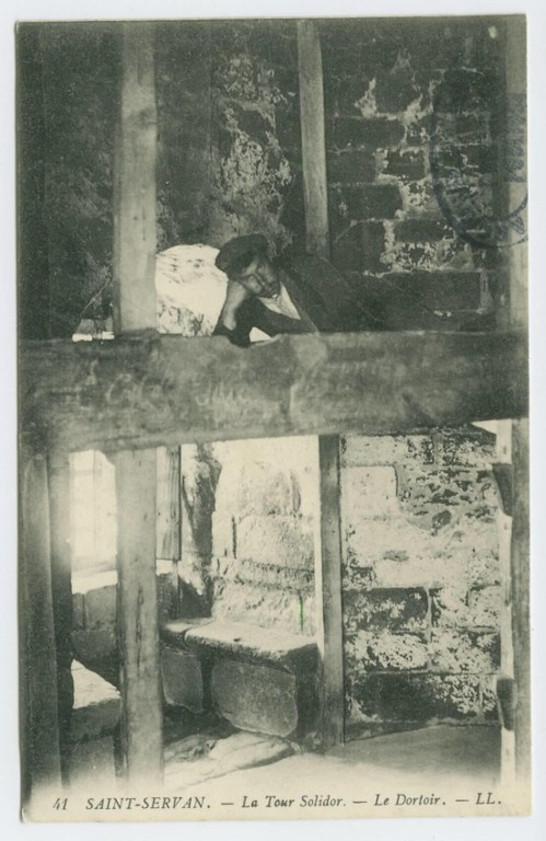 Vue intérieure de la tour Solidor : premier étage, tour nord, niveau intermédiaire à usage de dortoir, carte postale (LL). A droite, le poteau est muni de plusieurs marchesImmatriculation