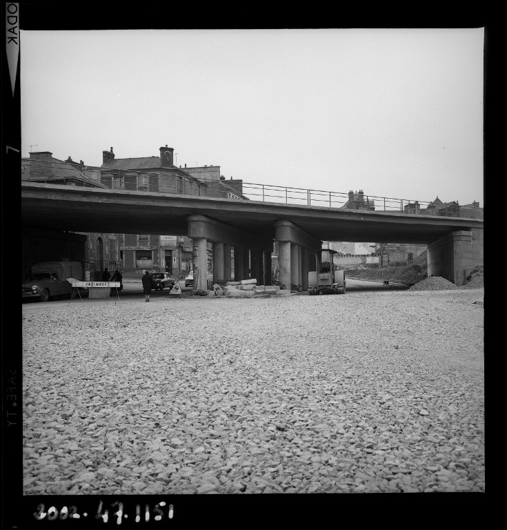 Vue animée du pont de Nantes en construction et de la nouvelle route. En arrière plan, on distingue le café du pont de Nantes. Février 1965.Immatriculation