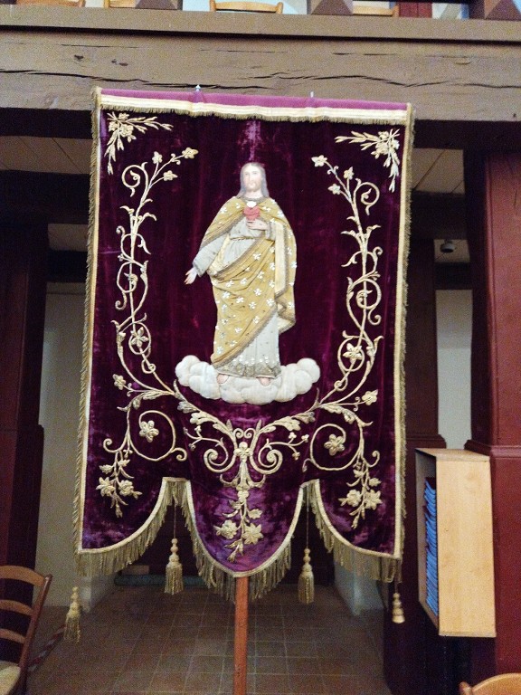 Bannière de procession de paroisse : saint Michel, Christ du Sacré-Cœur, église paroissiale Saint-Michel (Bruc-sur-Aff),