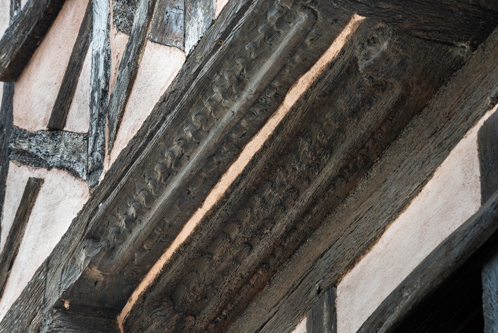 Motifs sculptés sur les entretoises et la sablière de chambrée.Immatriculation