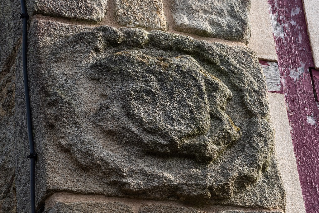 Ecu sculpté sur l'un des murs gouttereaux, entouré d'un motif cordé.Immatriculation