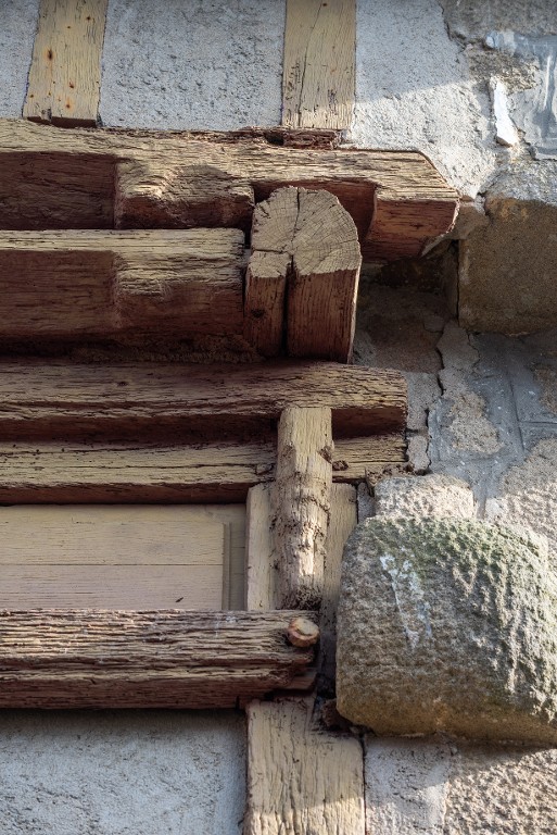 L'assemblage des éléments est ici bien lisible : le poteau cornier, appuyé contre le mur, reçoit la sablière de plancher. La solive de rive s'ancre par-dessus et reçoit la sablière de chambrée, par enfourchement.Immatriculation