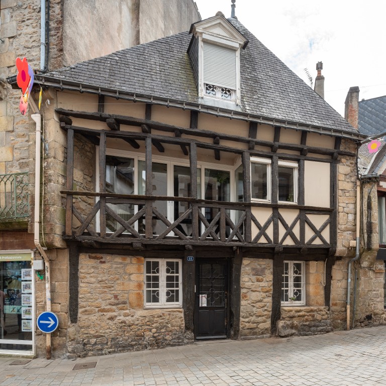 Le pan de bois de cette maison est comblé au rez-de-chaussée et évidé à l'étage (11 rue du Belzic).Immatriculation