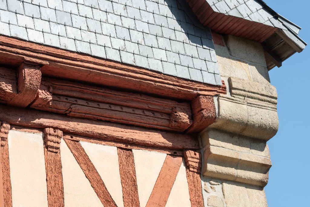 Moulures et décor géométrique sur une entretoise sous le pignon.Immatriculation
