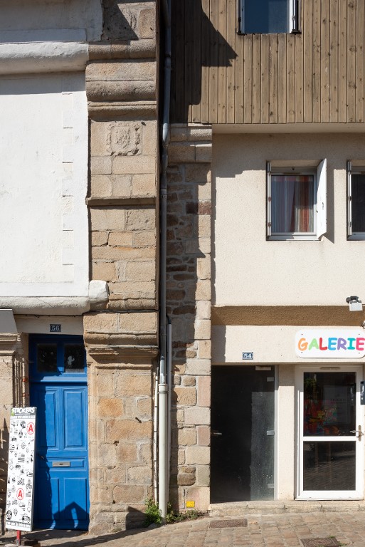 Ecu sculpté sur le gouttereau. La maison mitoyenne à droite est un ancien édifice en pan de bois.Immatriculation