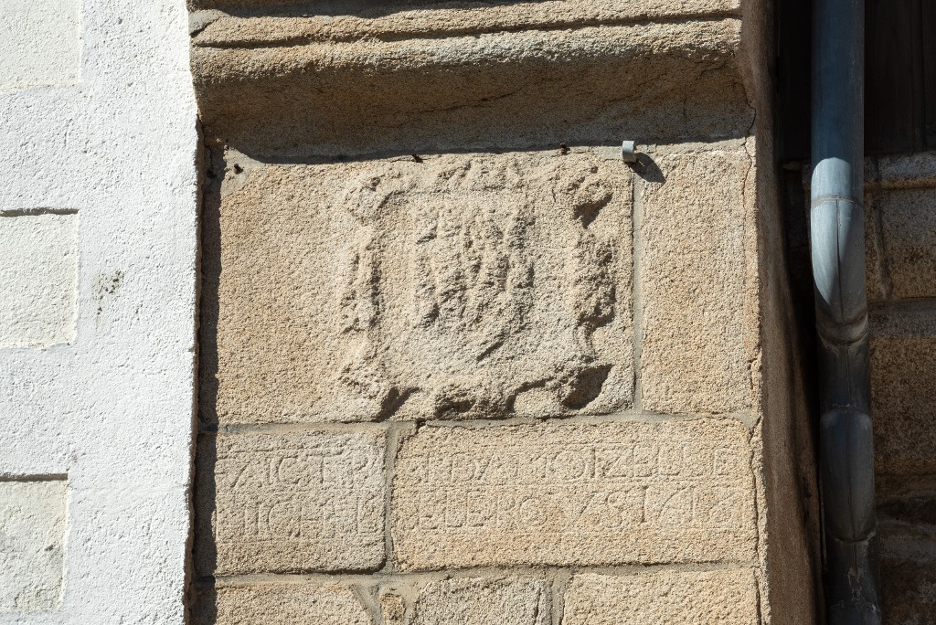 Blason bûché sur le gouttereau nord. Dessous, inscription "Faict par damoizelle Michelle Le Rou 1618".Immatriculation