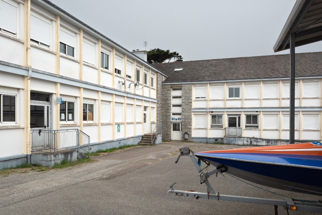 Façades sud et ouest de l'internat. Yves Guillou et Georges Tourry, architectes, 1959. A droite, l'auvent des ateliers bateaux.Immatriculation