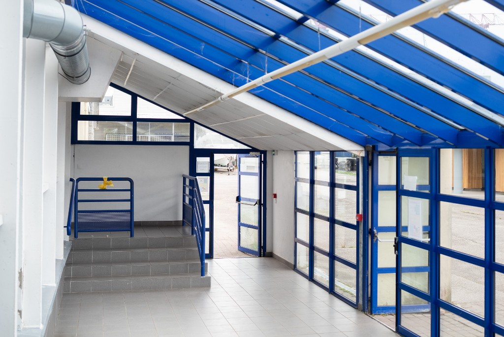 Espace d'attente couvert du self-service de restauration.Immatriculation