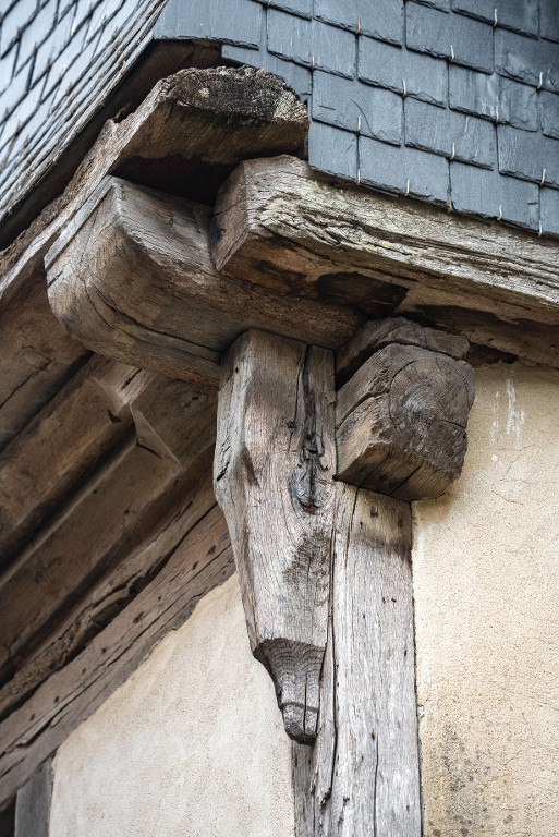 Détail de l'assemblage entre le poteau cornier, la sablière de plancher, l'entretoise, la sablière de chambrée et la solive d'ébordante.Immatriculation