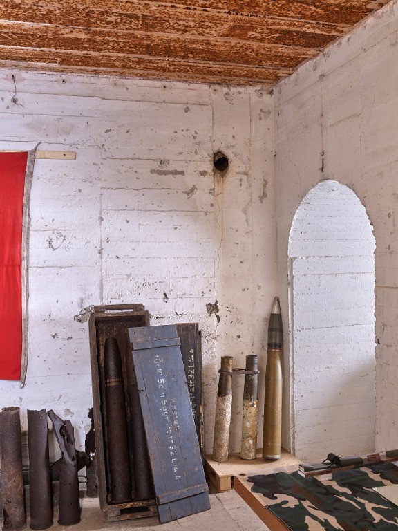 Vue intérieure : salle sud, porte en arc plein cintre (1,9 m x 1 m) donnant sur les salles situées au nord. Au centre, caisse à munitions pour deux projectiles de 10,5 cm provenant du Cosquéric (Kasten für 10,5 cm Spgr Patr 32L/44)Immatriculation